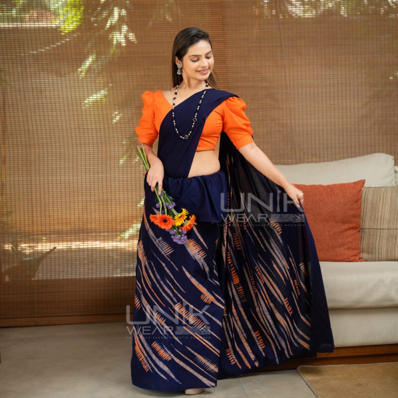 Handcrafted Cotton Batik Saree 2609 – Orange and Blue Saree