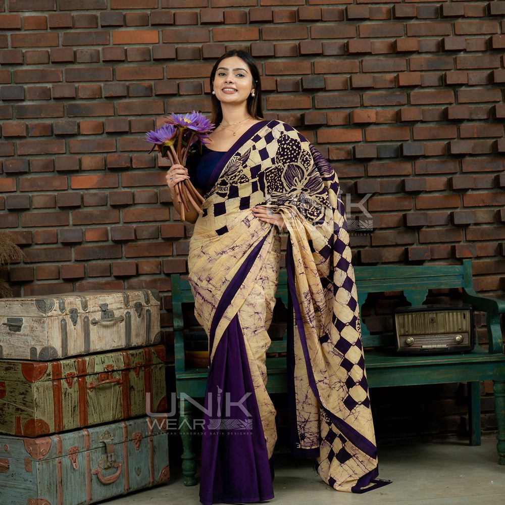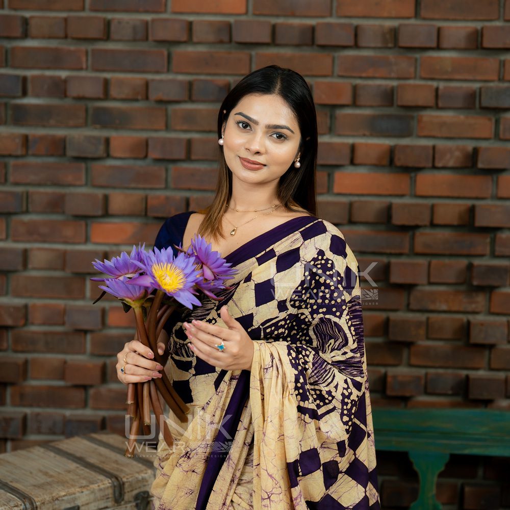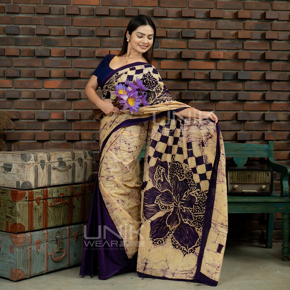 BEIGE & PURPLE SRI LANKAN HANDMADE COTTON BATIK SAREE 2104