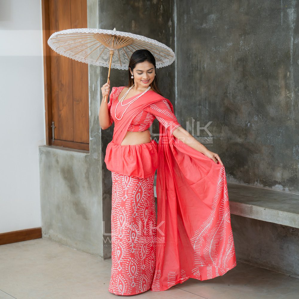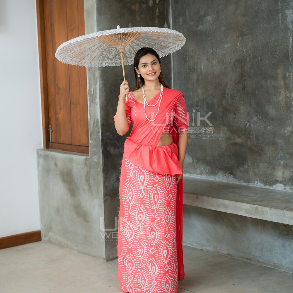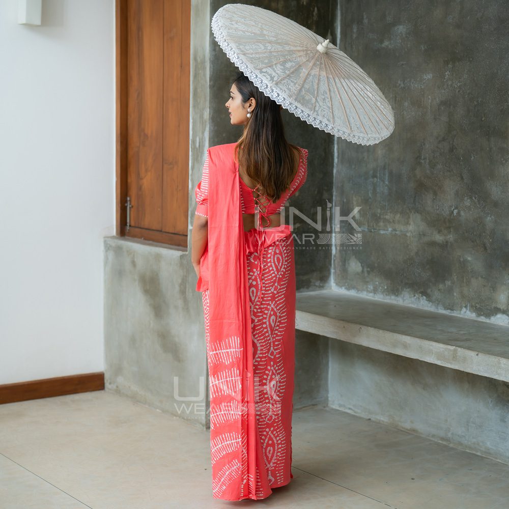 SALMON PINK & GREEN SRI LANKAN HANDMADE COTTON BATIK SAREE 2108